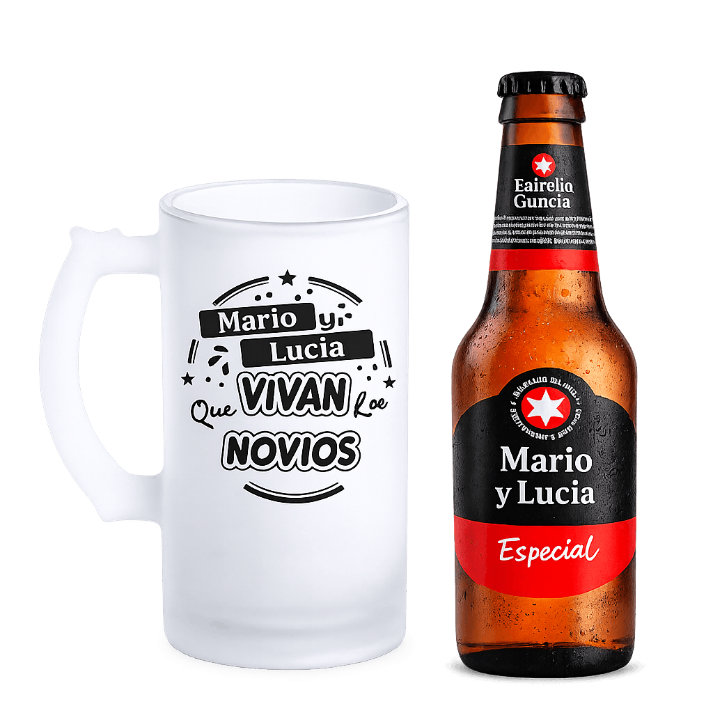 Celebra un día tan especial con un detalle único y original. Este pack de boda personalizado incluye una jarra de cerveza efecto hielo con el diseño “Que vivan los novios” y una cerveza personalizada con los nombres de la pareja.